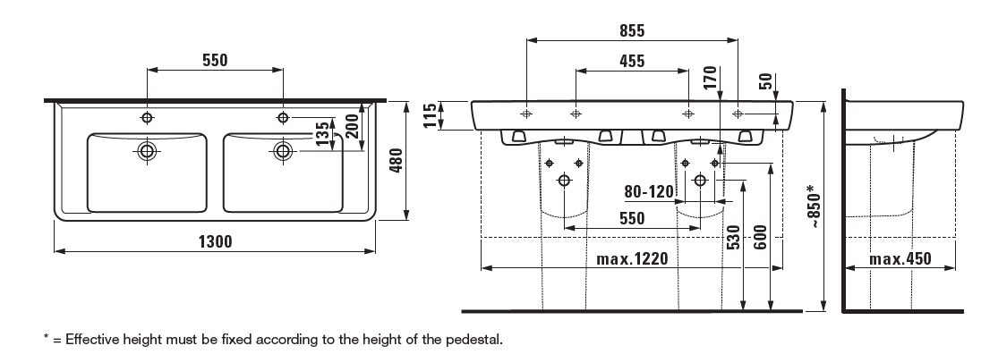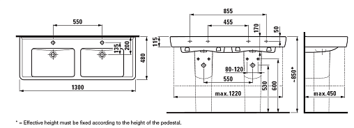 Pro A 130х48х11,5см, подвесная раковина, санфарфор, двойная, без отверстия для смесителя, арт. 8.1496.7.000.109.1, Laufen