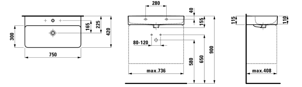 Val 75х42х11,5см, подвесная раковина, SaphirKeramik, с отверстием под смеситель, арт. 8.1028.5.000.104.1, Laufen